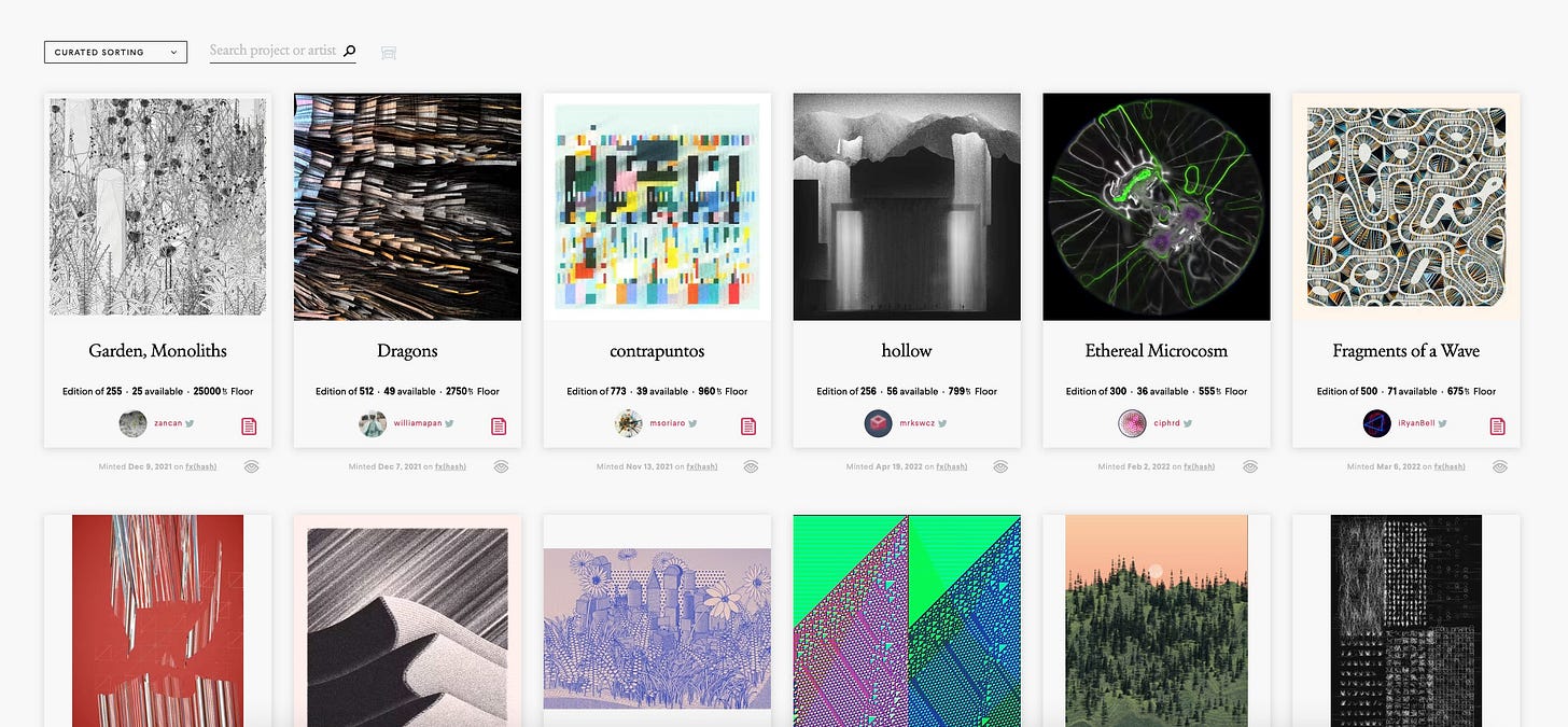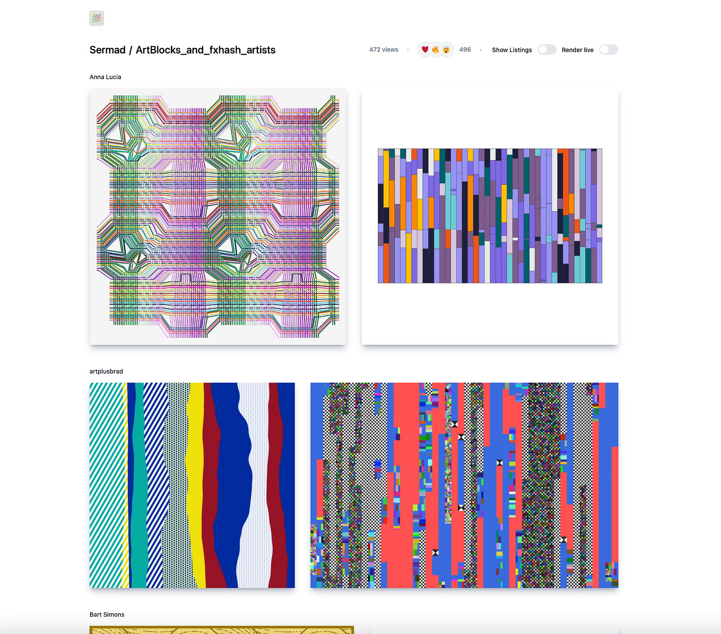 So, I was excited when I came across this gallery, made by Sermad, that shows cross-over artists who have done work on both Artblocks and FXHash. This was one of the lightbulb moments for me, showing me that FXHash art is underrated.