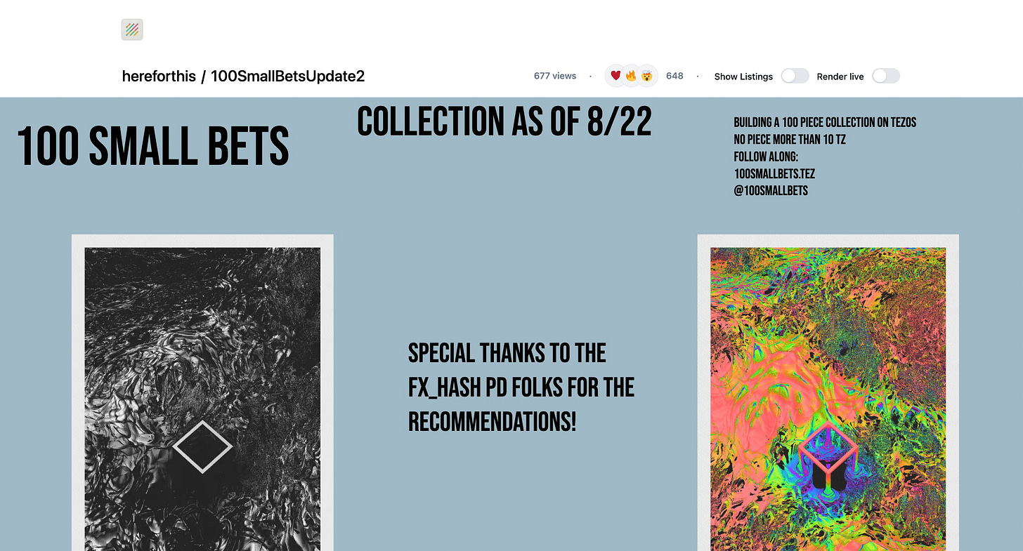Herefor_This is building a 100-piece collection on Tezos. No piece is more than 10 Tez. You can follow them at 100smallbets.tez and 100smallbets. I love this concept. Check it out here: