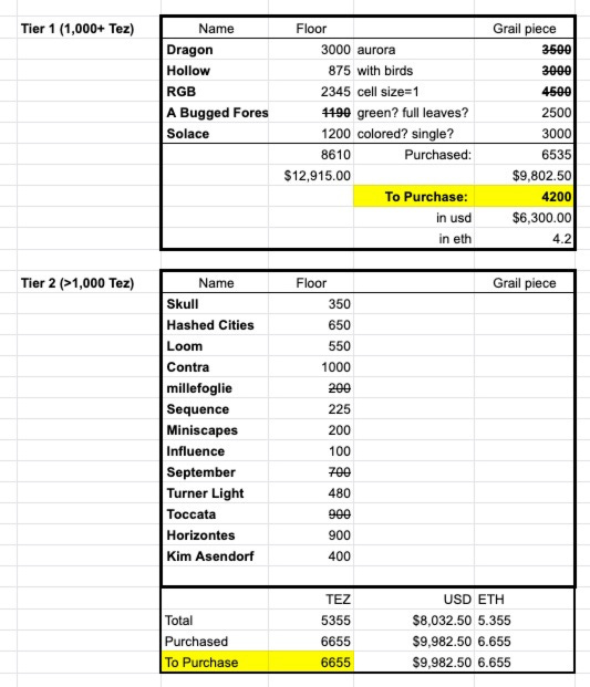 The first is the least risky, but the least upside potential (I think!): Established Gralis. The second bucket is collecting established pieces that have not “run up” yet, I’m calling these: Potential Gralis. And the third bucket is the riskiest, but most potential upside: Minting New Collections. These essentially break down by amount of Tez (above or below 1,000, to keep things simple).