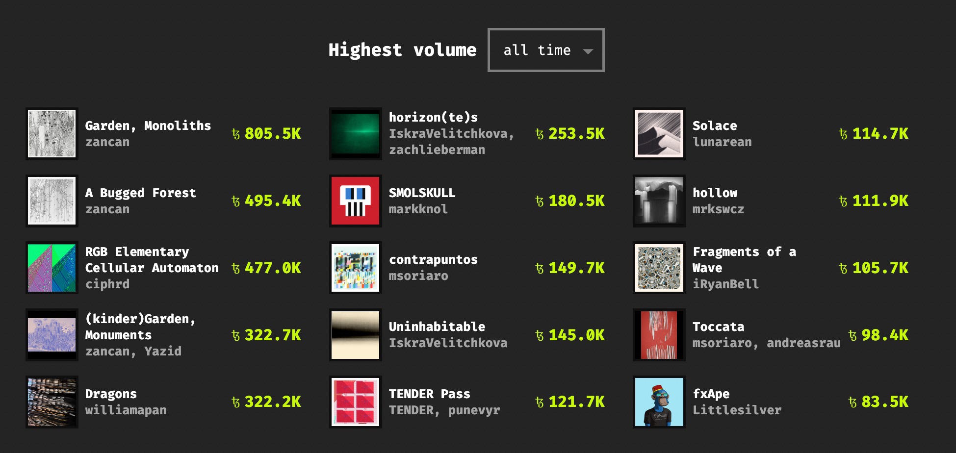 I do think that the all-time high stats are directionally correct if you were to ask artists and collectors who they thought should be considered in the top 5 list today. Others on that list right now include: Dragons, horizon(te)s, contrapuntos, Uninhabitable, Solace, hollow, Fragments of a Wave, and Toccata. (I did not include PFPs or Tender Pass).